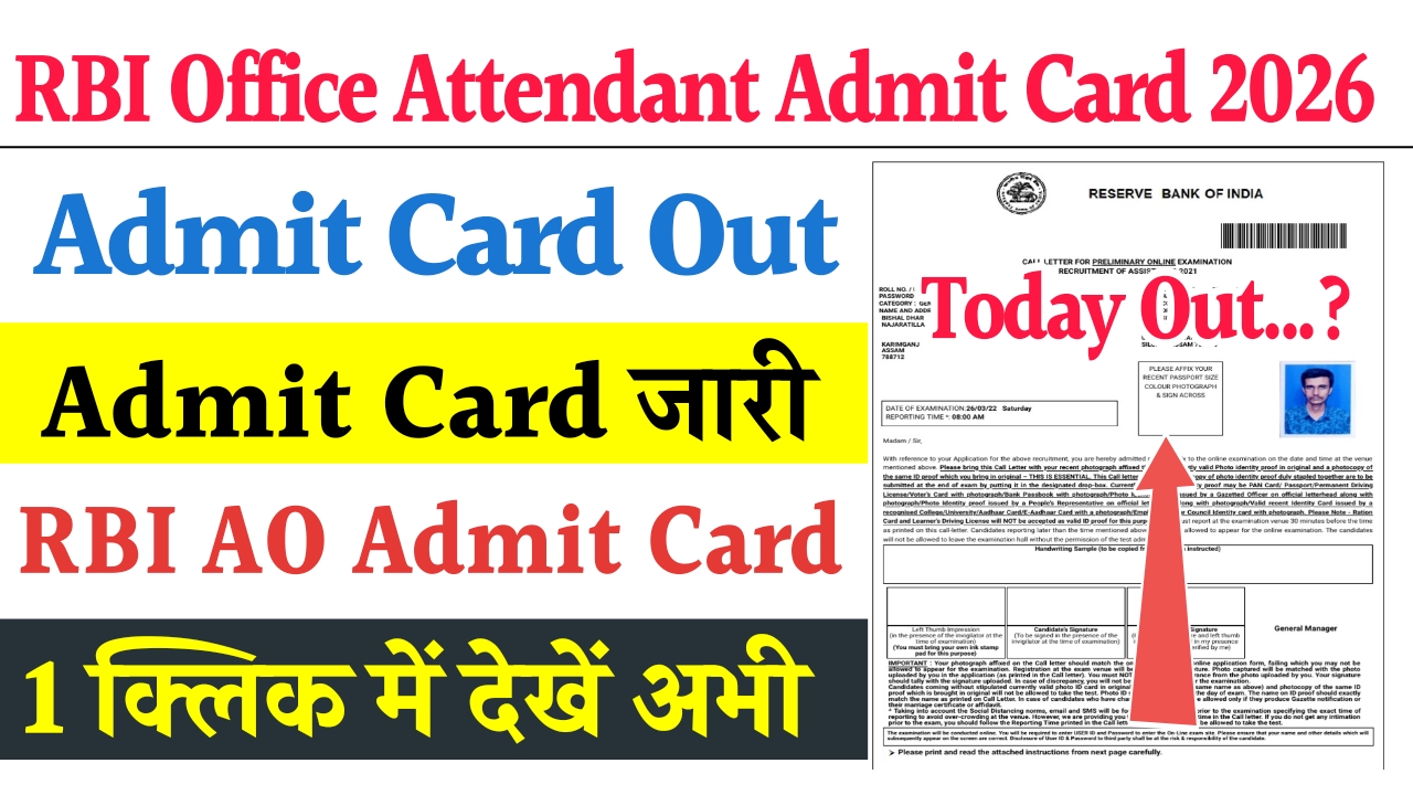 RBI Office Attendant Admit Card 2026 जारी, यहां से करें डाउनलोड – जानें परीक्षा तिथि और एग्जाम पैटर्न February 22, 2026 by Himanshu Chaliya